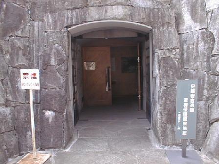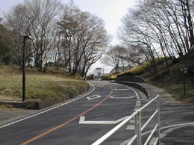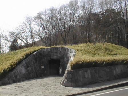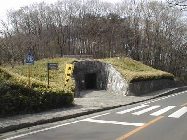 下左の写真、道の峠の左側にA地点、右側にB地点のモニュメントがある、B地点は展示ドームになっており、地層