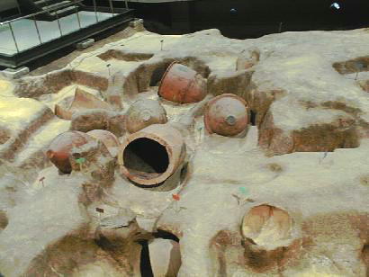 この遺跡からは、348基の甕棺墓(素焼きの甕や壺をお棺に使用するもの)と、119基の土こう墓(土を長方形に