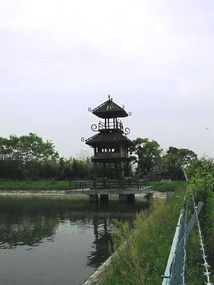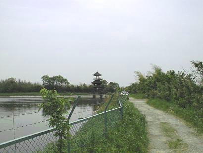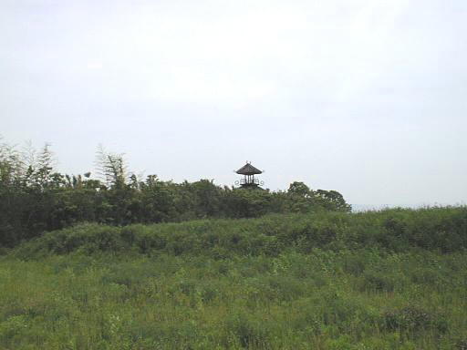 駐車場から「楼閣」が見える。駐車場の端から畦道を登っていくと池の中に復元建物が建っている。