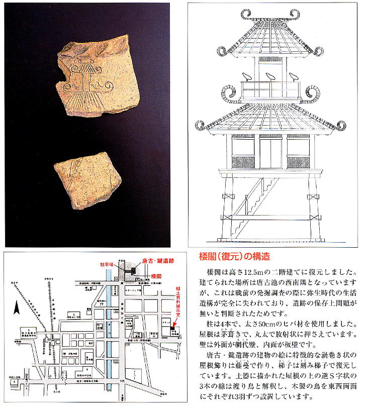 しかし、この遺跡の名を有名にしたのは、平成3年に発見された「楼閣」の絵が描かれた土器の破片である。
