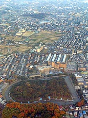 継体天皇陵(手前)と今城塚古墳(奥)=大阪府茨木市で、本社ヘリから