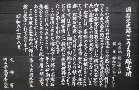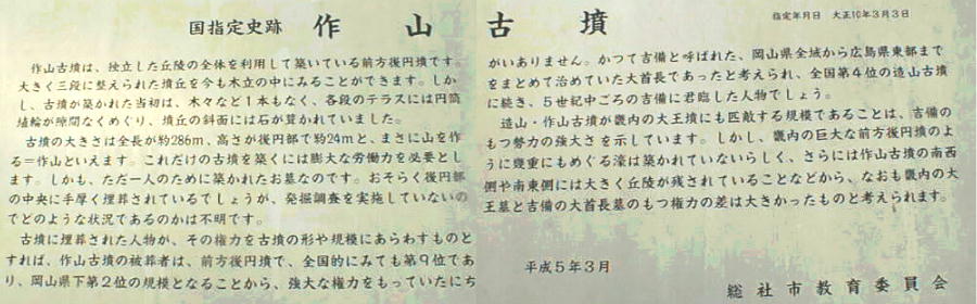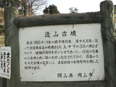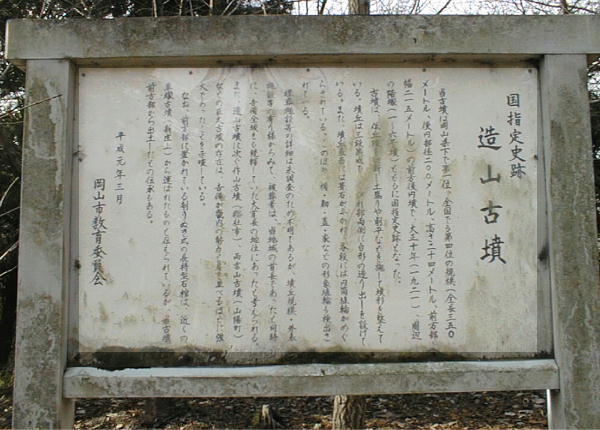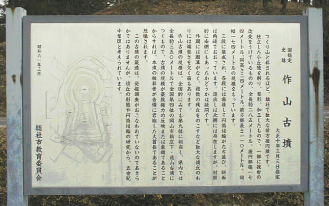 岡山県下2番目、全国でも9番目の大きさを持つ前方後円墳。全長286m、高さ24mで3段から成る。岡山市の造山古墳の少し