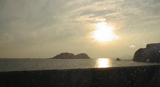 車窓からみた暮れてゆく田辺の海。夕焼けはいつももの悲しい。さぁ、今夜の宿を目指して一目散。