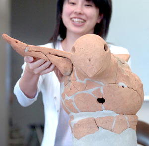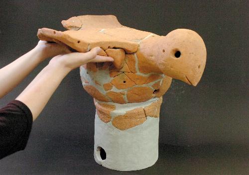 同古墳群にある前方後円墳(大日山35号墳)の東側のくびれ部分で見つかり、破片をつなげる復元作業をしていた。鳥形