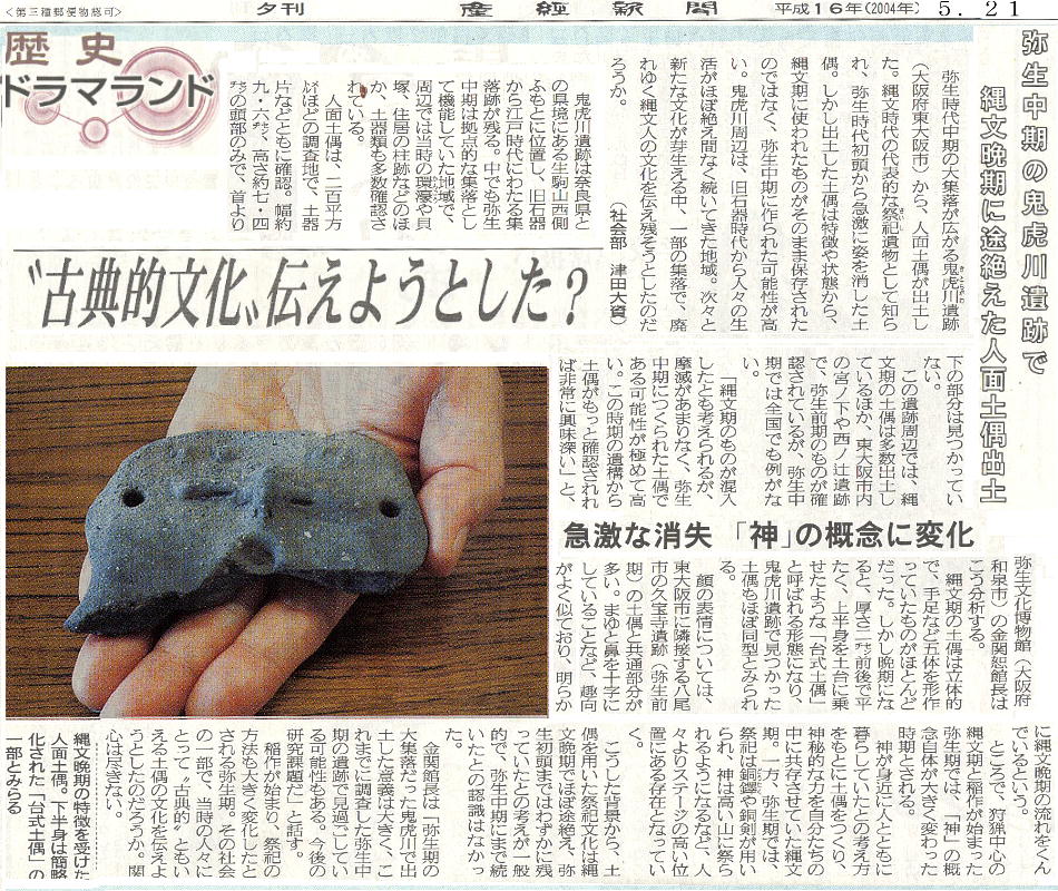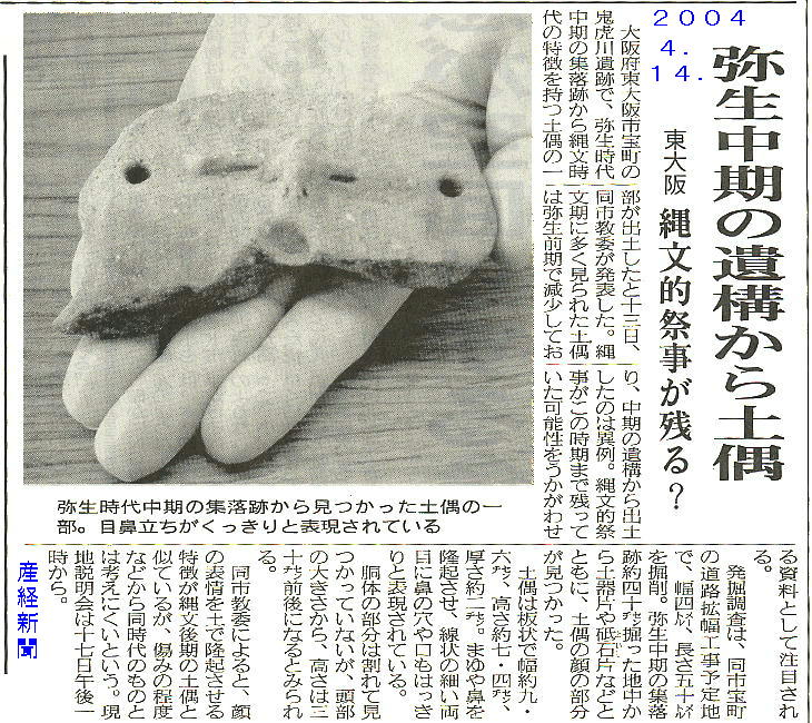 る。弥生中期中ごろのつぼやかめなどと一緒に穴から出土した。似た形の縄文晩期の土偶は近畿で多数見つかっており、その