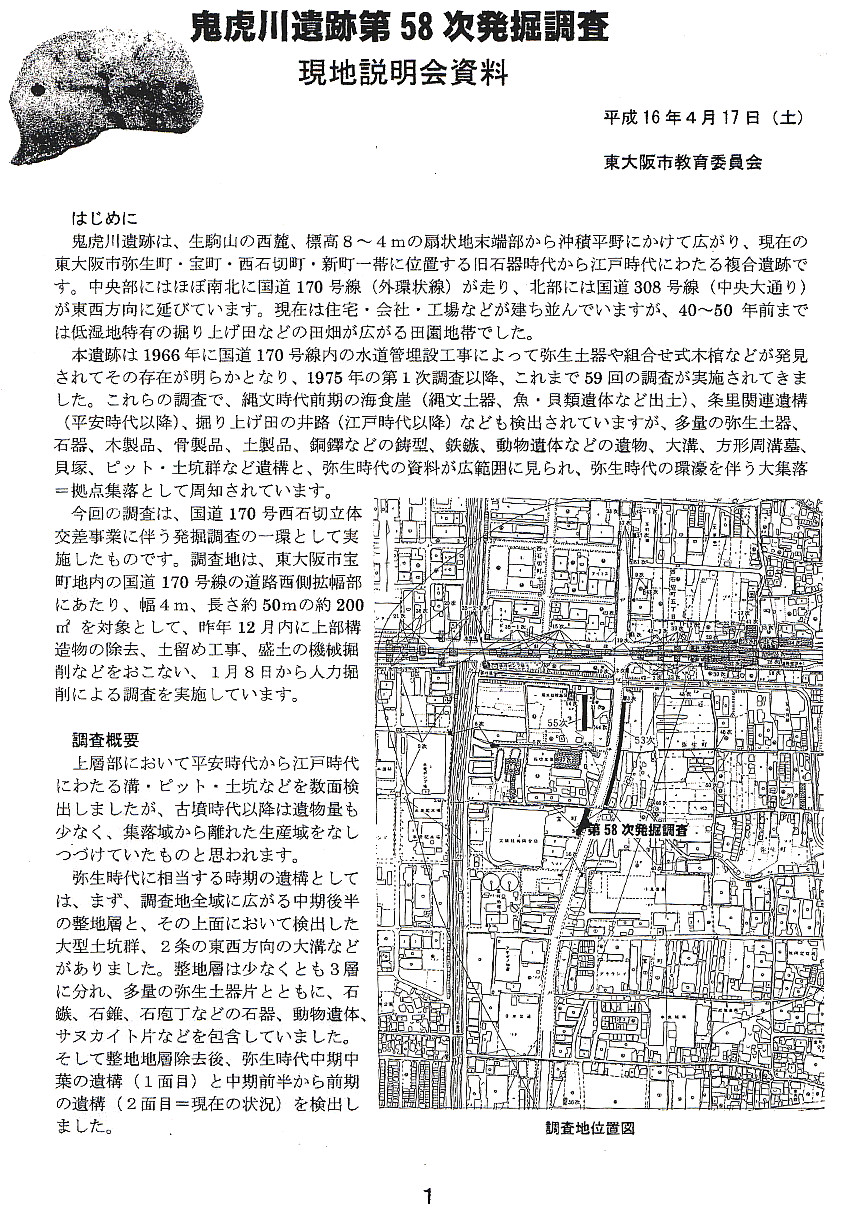 鬼虎川遺跡は河内(大阪府東部)で最も早く弥生文化を持った集団が住み着いたとみられ、全盛期の弥生中期は拠点集落の