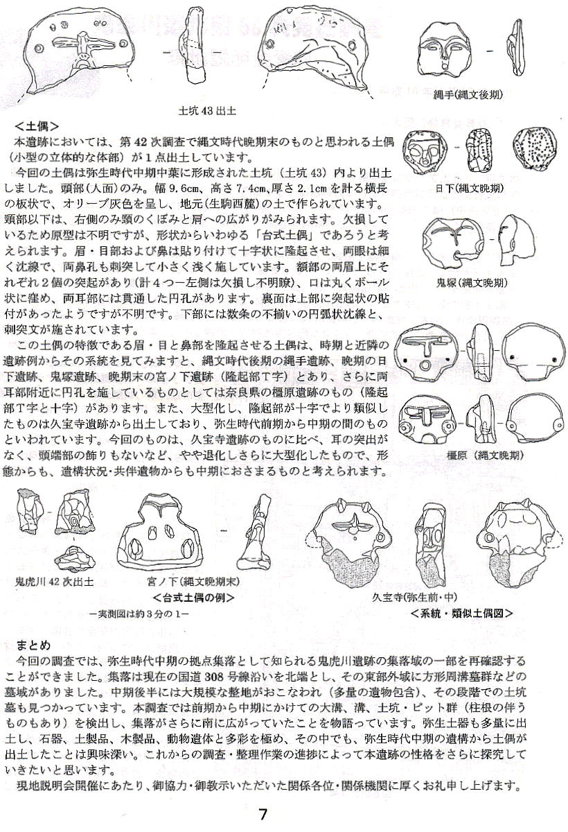 は縄文時代を代表する祭祀遺物で、弥生中期の例は知られていない。土偶の頭部は幅約10cm、厚さ1−2cmの板状。ま