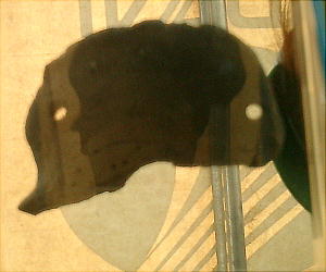 裏面が見えるように下に鏡が設置してあったが、デジカメにはうまく映っていない。ほんとに顔に付けたような紐穴があいている。