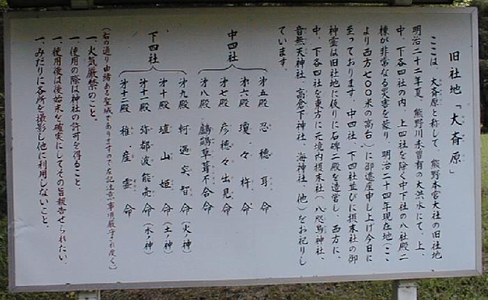 下の案内板にもあるように、元々熊野大社本宮は川州の中に建っていた。大洪水で本宮全体が流され、明治時代に現在の
