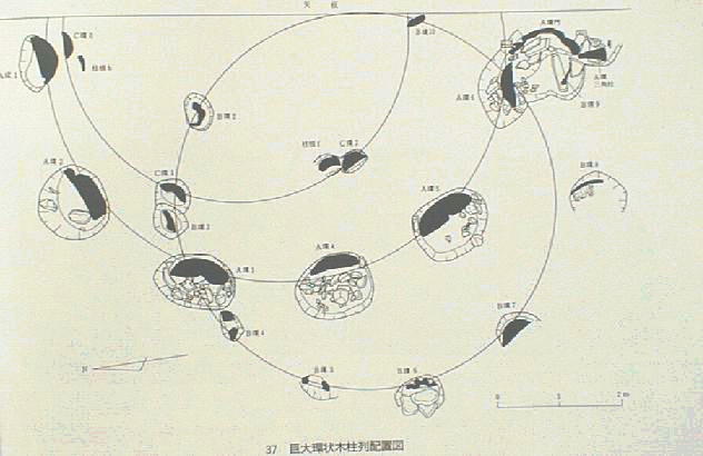 真脇遺跡の巨大木根の直径は99cmと、チカモリ遺跡のものを上回る大きさで、直径6.2m、5.3m、7.5mの3つの真円上に、ク