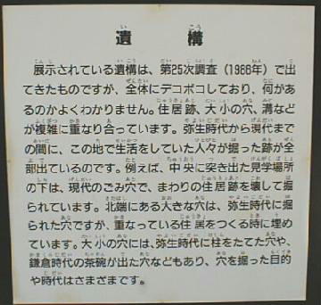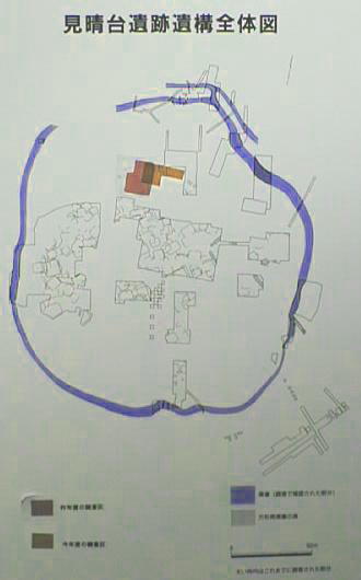 台地全体を環濠で囲み、多くの竪穴式住居跡が発掘されているが、何度も建て替えられているため住居の総数は不明である。