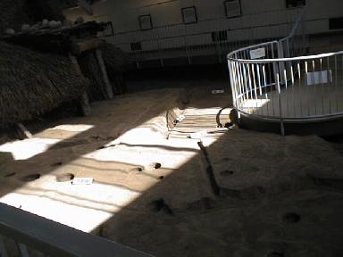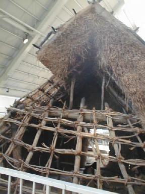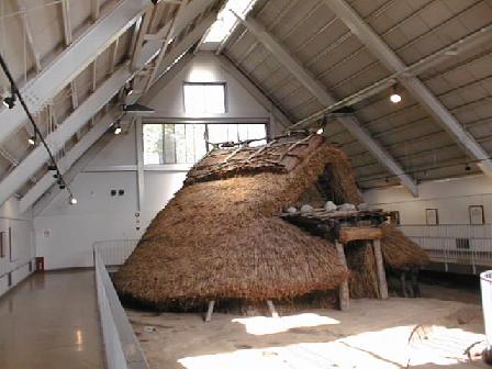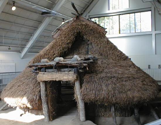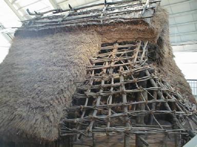 一部藁葺きを除いて住居の内部が見えるようにしてある。弥生時代の竪穴式住居にしては少々構造が複雑なような気もする。