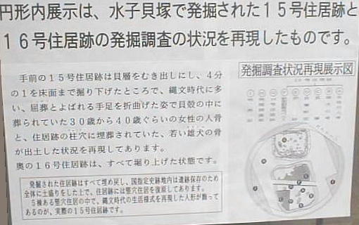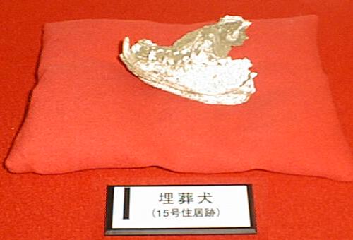 会による調査では、15号住居の貝塚の下から30代と思われる女性の屈葬人骨と、脇の柱穴から若い雄犬の骨が出土している。