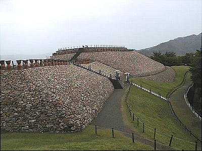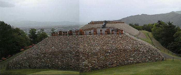 バスを降りて林の中を1分ばかり行くと、目の前に葺石を並べた古墳が突然出現し驚く。山の頂上にこんなドデカい古墳を