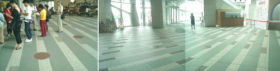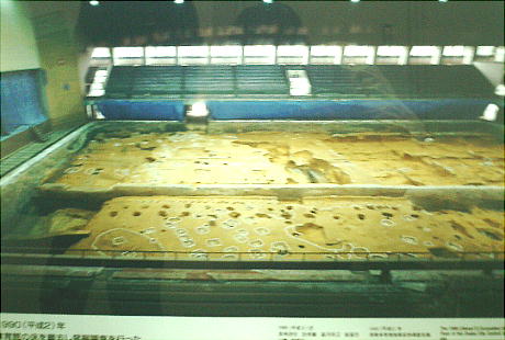 いる。また、床にはタイルでその範囲がわかるように色分けがしてあるし、柱が立っていたあとは丸いタイルが埋め込まれ