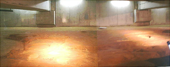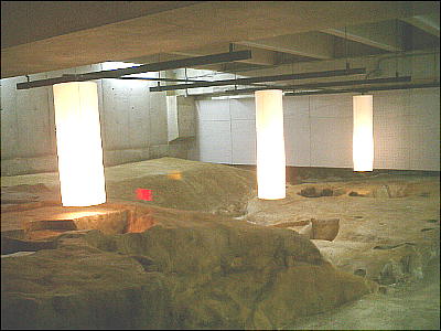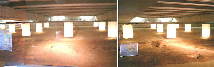 灯籠のような光の柱が、ここに建っていた「掘立式建物」の柱の位置である。遺構は薄暗くデジカメもあまり良い仕事をしていない。
