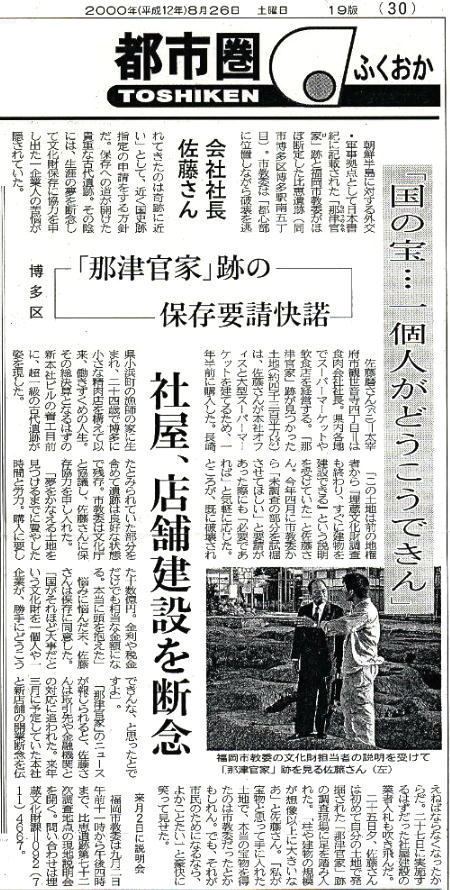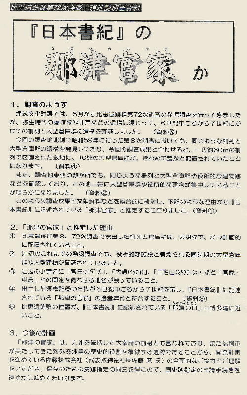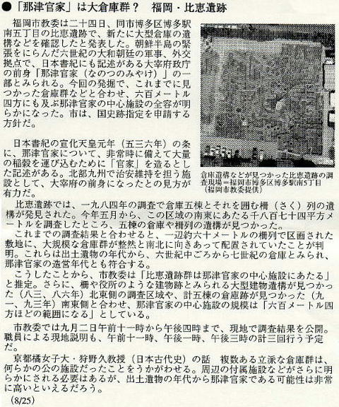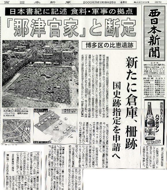 元新聞記者で、今福岡で編集事務所をやっている友人の渕上君から、8月中旬、福岡市博多区で発掘された「那津官家跡」