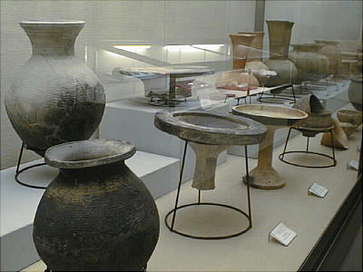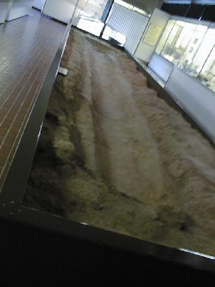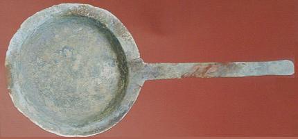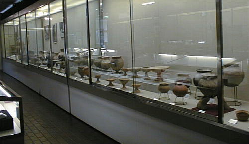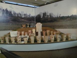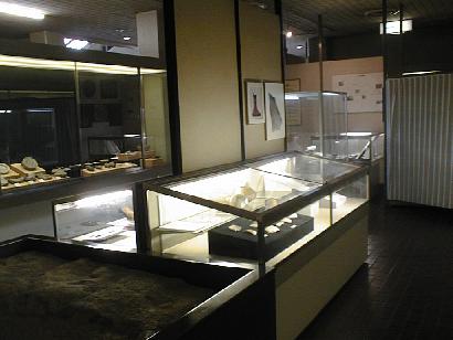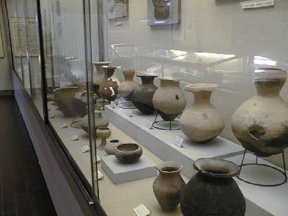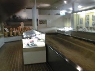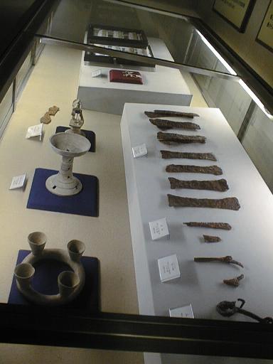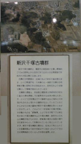 <126号墳> 126号墳は、5世紀後半頃に築かれた東西 23m、南北16mの長方形墳である。この古墳は外見上なんら他の古墳と変わりは なかったが、その副葬品は驚くべきものであった。遠くペルシャで製造され、シルクロードを経て中国から我が国に運ばれ てきたと推測されるガラスの鉢・皿、竜文の透かしを持つ冠の金具や垂下式耳飾り・指輪等の装身具、我が国で始めて出土 した火熨斗(ひのし:古代のアイロン)など、いずれも現在重要文化財に指定されているすばらしい出土品である。これら は現在全て東京国立博物館に展示されており、この千塚資料館にはレプリカがある。初めてこのガラス器を「東京国立博物 館」で見たときは、そのすばらしさに声もでなかった。1500年も前にこんなものが中近東から、と思うと人間の営みの偉大 さに感動してしまう。特筆すべき出土品により、この126号墳は新沢千塚古墳群を代表する古墳となった。以下がその出土品。