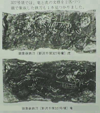 火熨斗(ひのし : 上左) (直径15a、全長32.7a)。この古墳が発掘された当時は我が国唯一の出土だったが、その後大阪府柏原市の 高井戸古墳からも出土した。(日本での出土はこの2例だけ)。フライパンの底のような部分に火(おそらく 炭)を入れ、熱で衣服のしわを伸ばす古代のアイロンである。中国公州の武寧王の王妃の墓から青銅製火熨斗 が出土しており、おそらく126号墳の被埋葬者も盟主の妻かそれに匹敵する貴婦人の墓ではないかと推測できる。 また副葬品には大陸系の色合いが濃い事から、被埋葬者は渡来人もしくはその直系と思われる。 (これはこの古墳群の多くの被埋葬者について言える。) 金製方形板(上右) (8.4a x 8.3a)。龍の文様のすかしがあり、周囲に歩揺(ふよう)が取り付けられている。冠の金具と見られる。 橿原市立千塚資料館