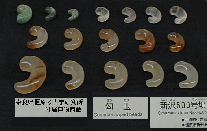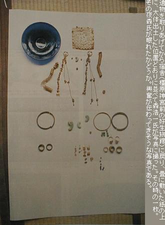 (上左から) ★−ガラス碗(口径7.8a、高さ6.7a)、丸くカットした文様が底で2段、胴の部分で5段にめぐっているが一部は仕上げ られていない。口縁もギザギザで未完成品と考えられる。 ★−金属製の垂下式耳飾り。全長21aと長く、3本の鎖には細金細工の飾りが付けられている。 ★−ガラス皿。(口径14.5a、高さは3a)。もとは金箔の人物や馬の絵があったと見られる。 ★−上はガラス製小玉。下はガラス製雁木玉。 ★−金製指輪。下2つは全面に装飾を持ち、真ん中は金地を4〜5重に巻いて表面に刻みがある。 1963年当時発掘を担当していた同志社大学教授森浩一氏は言う、 「藤ノ木古墳の遺物はせいぜい中国止まり。新沢千塚古墳ははるかに飛び越えてヨーロッパの遺物が出ている。戦後の発掘 調査で遺物がヨーロッパまで及んでいたのはここだけです。」 「鮮卑など中国の北方系の人達と古代日本人との接触は『古事記』にも『日本書紀』にも出てこない。しかし出てこないか らといって、接触がなかったと考えるのは大間違いだ。これまで渡来系と言うと、大部分は朝鮮半島や中国大陸を指してい たが、126号墳はそれをもっと広げてくれた。しかも遺物の一部はヨーロッパまでつながっている。」 そして 126号墳とはるか西方の遺物を結ぶルートとして、おそらく百済が中心的に介在し、北方の遊牧民族との接触を通し て入手した、という図式を描いている。