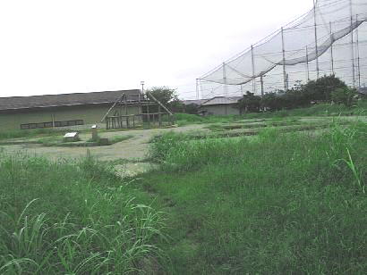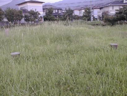 夏草がぼうぼうでわかりにくいが、草の中に建っている杭みたいなものが高床式建物の柱の跡である。