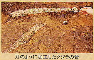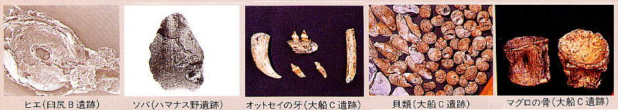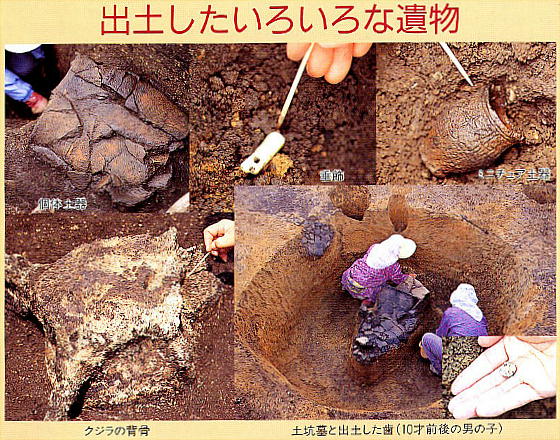 また当時食料としていた、クジラ・マグロ・シカ等の骨も出土している。墓坑からは、副葬された個体土器や「10才前後の