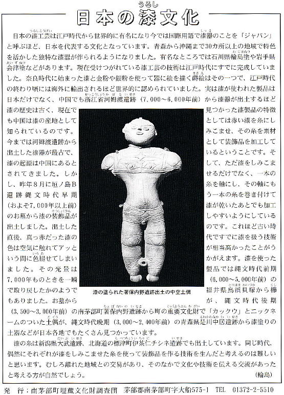 スファルトも遠隔地から入ってくる。通算すれば縄文時代早期から晩期に至る、約 7,000年間にわたって連綿と縄文文化が