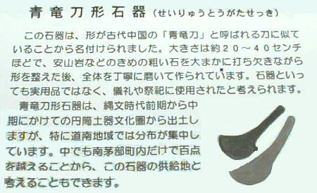 ろから、この地方が「青龍型石器の生産センター」だった事が分かる。三内丸山遺跡でもたしか 1,2点しか展示されていな
