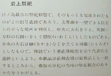 現在までに約23ケ所の古代祭祀遺跡が発見されている。斎(祭)場は、岩上→岩陰→半岩陰・半露天→露天と4段階の変遷