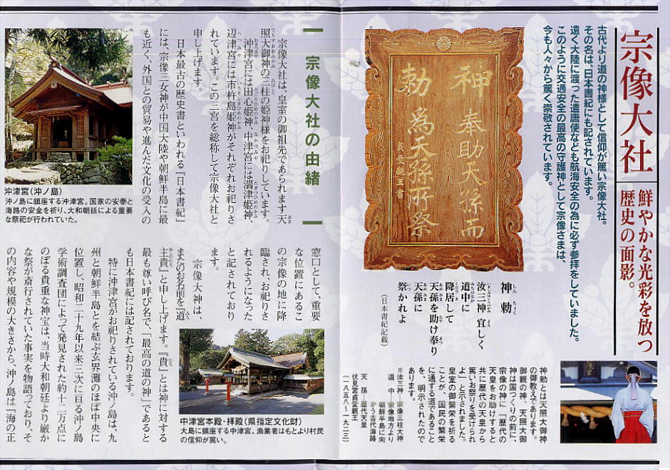 古事記・日本書紀によると、天照大神の子供である三女神は天照大神から「歴代の天皇を助け、歴代の天皇からお祭りを受