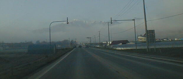 ■釧路から標津方面を目指して走っている時、突然目の前に現れた、雪をいただいた山脈。一瞬垣間見えてまた雲の中に消
