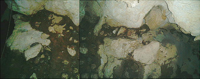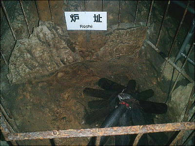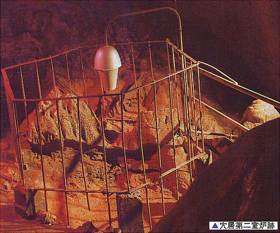 ら鉄製品が発見されるのは非常に珍しい。第二室には炉や、日用品を置いた岩棚がある。棚に乗せられていた壷が鍾乳石に