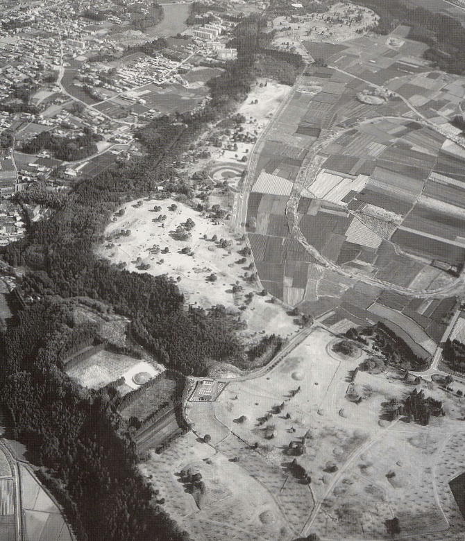 上空から見た西都原(さいとばる)古墳群全景。原(はら)を(はる/ばる)と呼ぶのは九州に非常に多い。