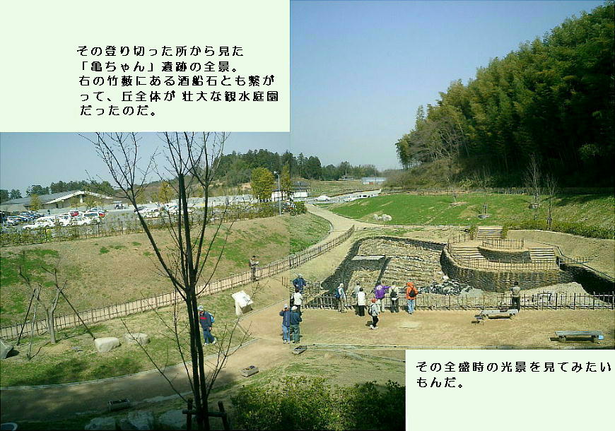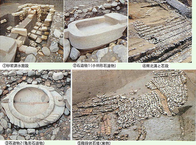 一方、丘陵の北側では亀形石造物を中心とする導水施設が平成12年に出土。斉明朝から持統朝にかけて、水を使