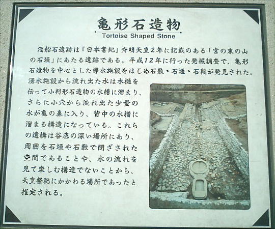 亀形石造物は、しっぽ部に栓をし、水をためて使っていたとみられるが用途は不明。また、亀の顔の延長は酒船石