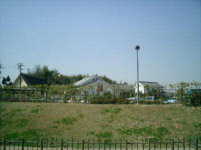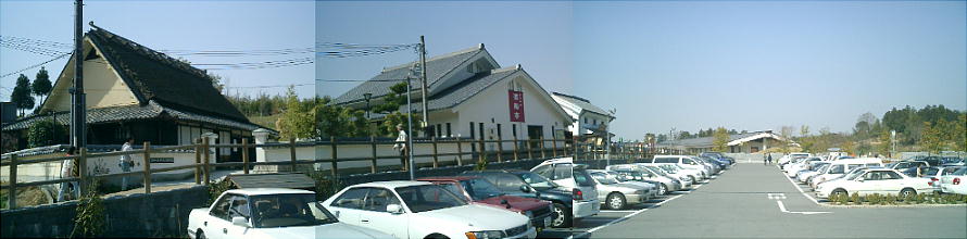 酒船石遺跡の前に立つ「奈良県立万葉文化館」。上の写真右奥が万葉文化館で、左側は飲食店と土産物屋である。