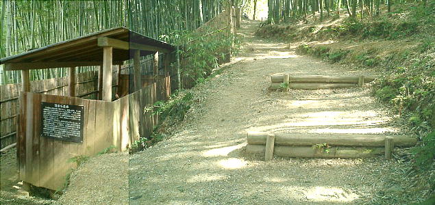 下左の小屋のような建物の中に、石垣状遺構を復元してある(上)。このような石段が、この山の斜面に何段にも