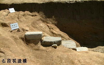 センチ、厚さ約35センチ)が階段状に10個近く見つかった。そばには切り石(一辺約30センチ)が多数あ