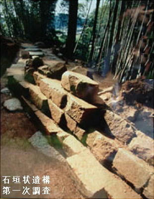 南東約200メートルの南斜面で、L字に積まれた石垣の基礎石を確認したと発表した。石垣はこれまで部分的