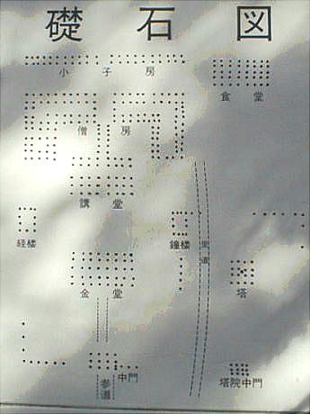 広場から緑の松林に囲まれた坂道を登ると、正面に金堂跡があり、廻りを取り囲むように僧坊跡・経堂跡・鐘桜跡・塔院跡などの礎石が