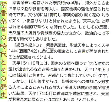 難波宮や恭仁京を造営中だった聖武天皇が、奈良時代中期の七四二(天平十四)年に離宮として造営を開始。七四三年に大仏造立の詔(みことのり)を出し、甲賀寺に大仏の骨組みとなる体骨柱を立てたとされる。七四五年一月に正式な都と公示されたが、その後、山火事や地震が相次ぎ、聖武天皇は同年五月に恭仁京へ移り、六月には平城京へ都が戻された。