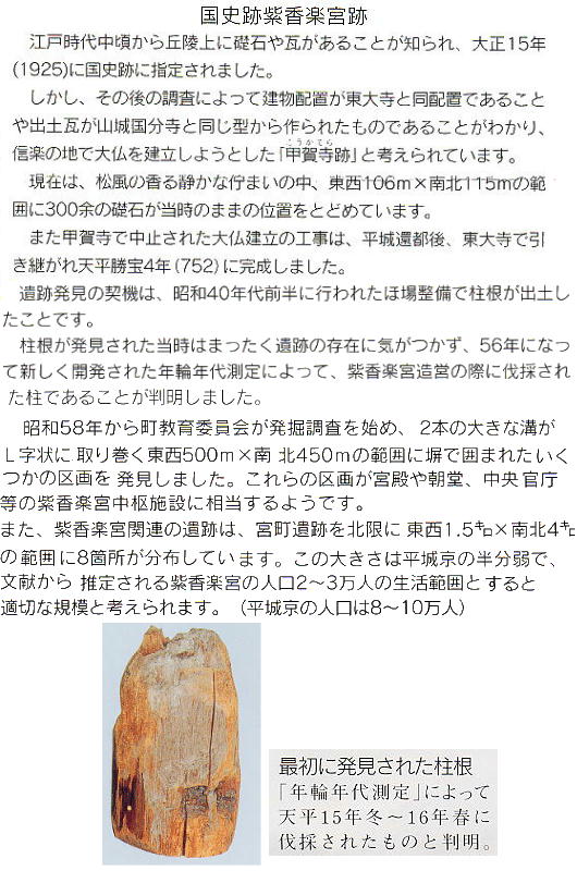 は紫香楽宮そのものの跡ではなく、大仏造立の詔( 741)により大仏の骨組みとなる体骨柱を立てたとされる「甲賀国分寺甲賀寺跡」で