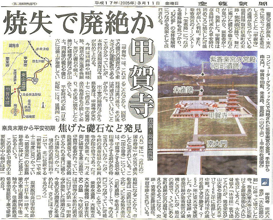 また、同遺跡の約一キロ南の新宮神社遺跡では、聖武天皇が大仏を造ろうとした甲賀寺と宮をつなぐ「朱雀路」の一部とみられる、幅約八・五メートル、長さ約九・五メートルの橋脚跡と、幅が最大約十二メートルと推定される道跡が見つかった。
