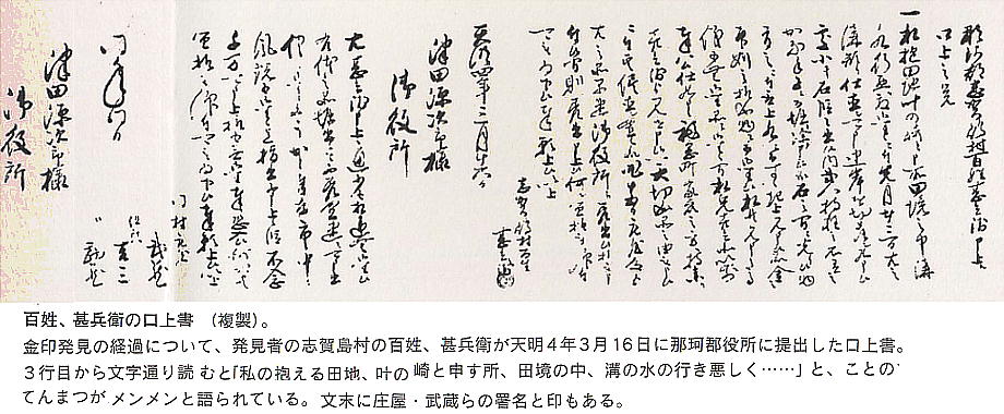 発見した2人が百姓「甚兵衛」のところへこれを持っていったものと言うことのようである。当時の志賀島村庄屋武
