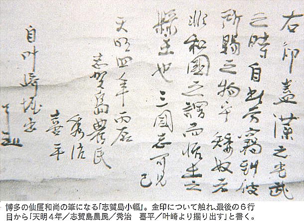 志賀島の「吉祥寺」という寺の古記録によれば、天明四年の項に「二月二三日小路町秀治田を耕し大石の下より金印