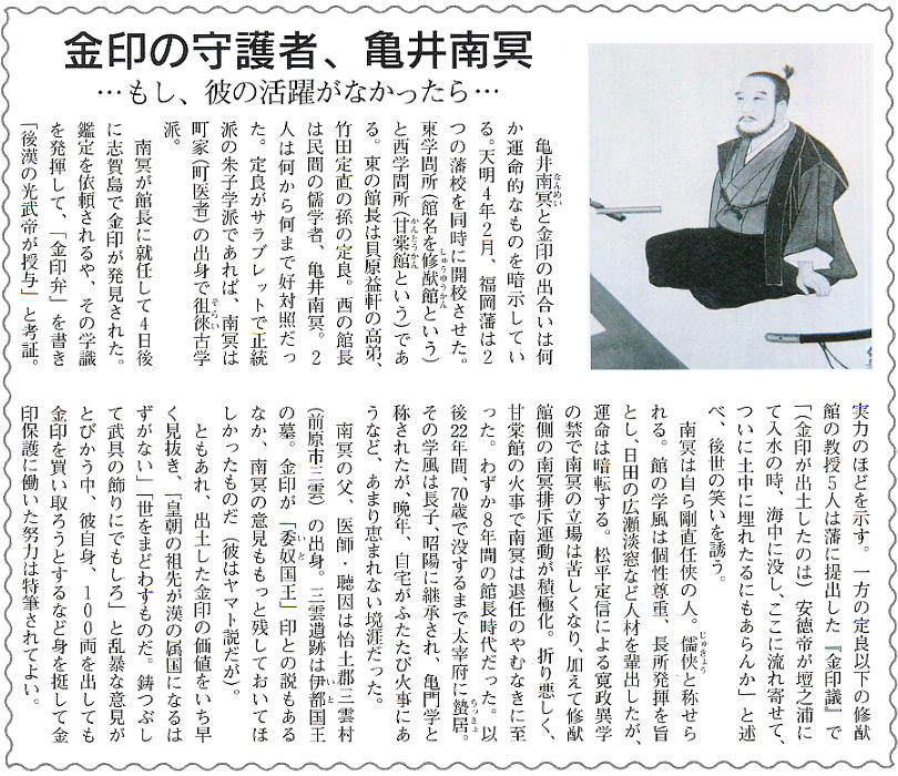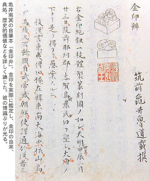 金印は、奉行の津田源次郎を通して黒田藩漢学者の亀井南冥に鑑定が依頼される。南冥は後漢書の中元2年(AD57)