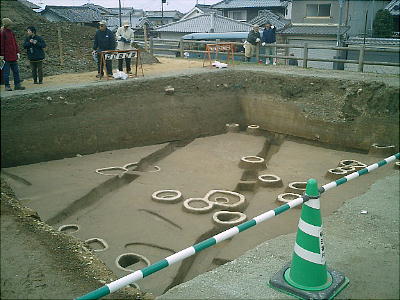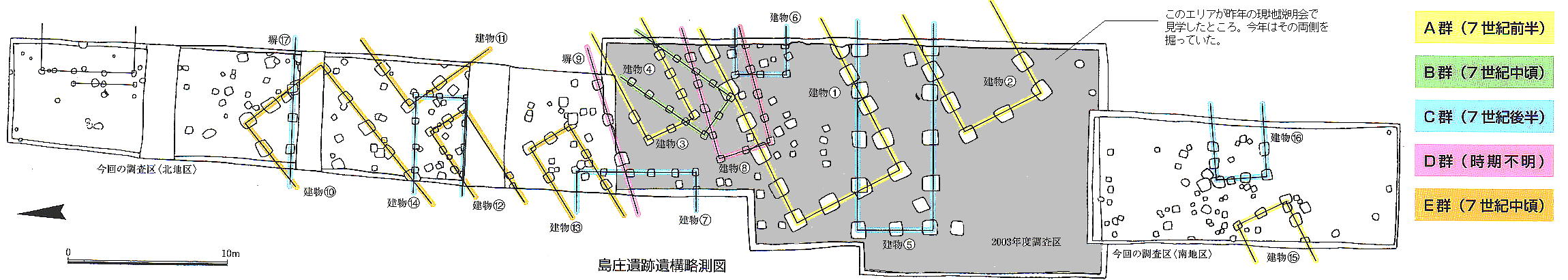 南北6bだった。前半の1棟は昨年見つかった馬子邸跡の南約援b、中ごろの4棟は馬子邸跡の北側に隣接していた。