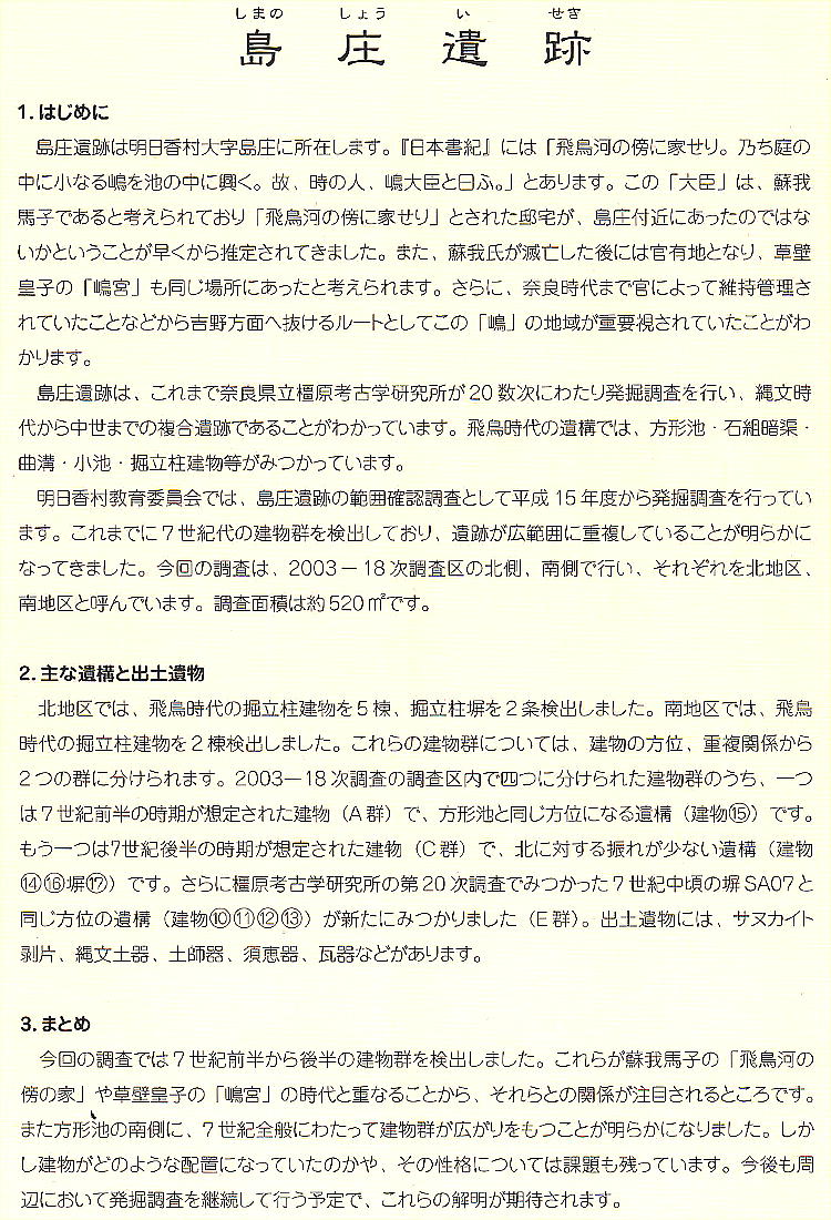 子の宮殿、天武天皇の皇太子の草壁皇子らが住んだ島宮などが登場しており、島庄遺跡にはこうした有力者の住まい