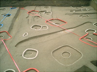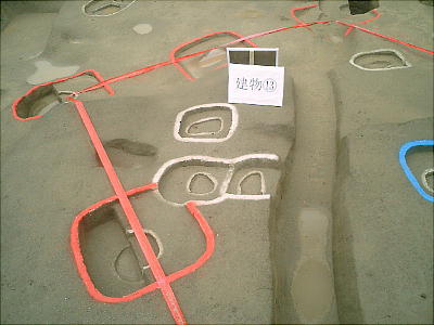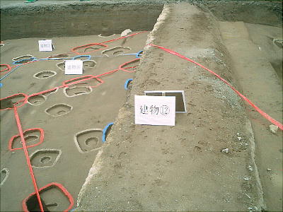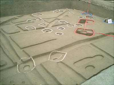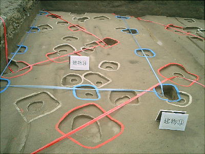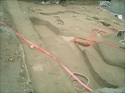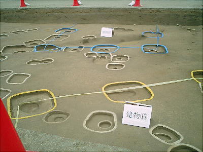 色つきのテープが建物跡である。発掘した時、廻りの土の色と違う部分が柱の跡で、そこをテープでつないである。