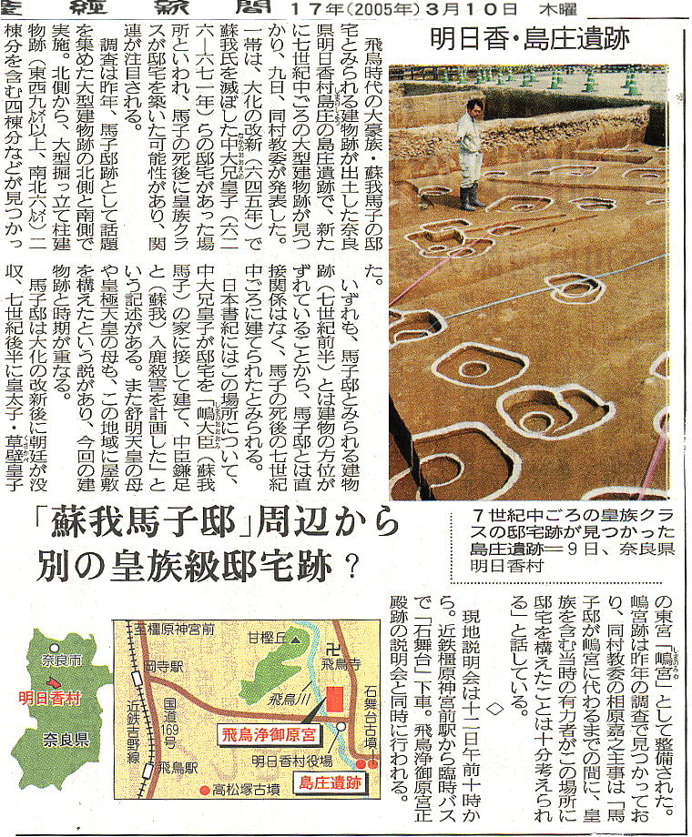 亡後、天皇家が没収して跡地に嶋宮が建てられたと記述しており、トータルでは、島大臣(蘇我氏)の家、中大兄皇